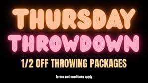 50% off Throwing is valid on Thursdays only. Cannot be combined with any other coupon, offer, or promotion, and not valid for use on parties or events with 10 or more throwers. Offer valid at participating Craft Axe Throwing locations only. Tax and gratuity not included. Void where prohibited. Additional restrictions may apply and offer subject to change or cease at any time.